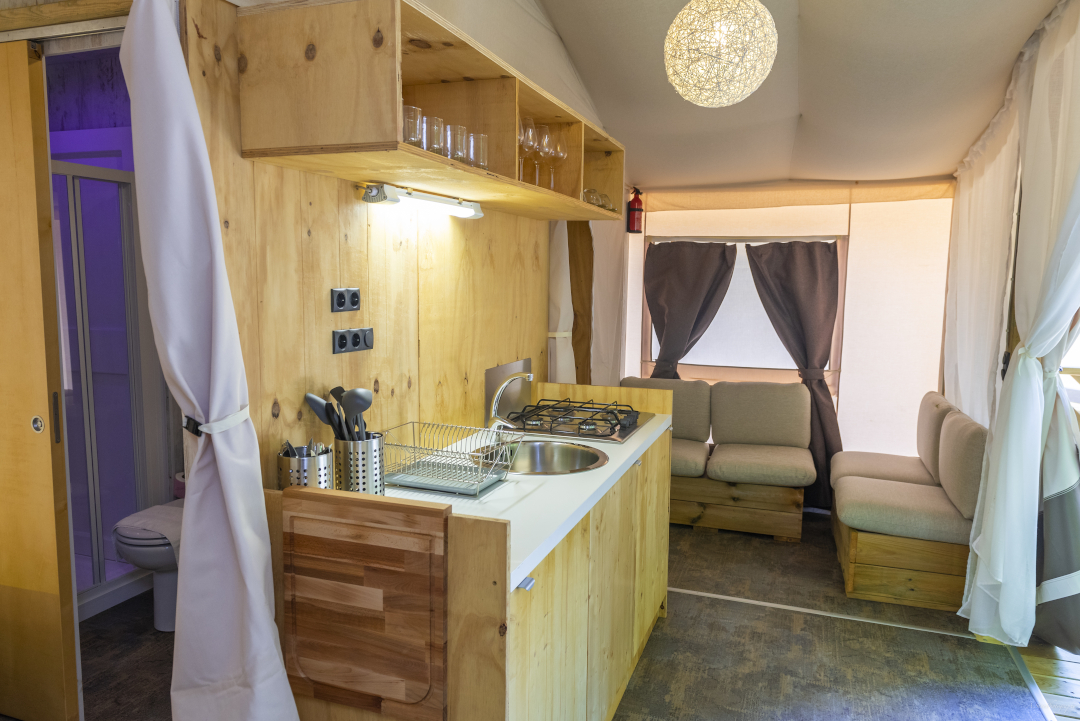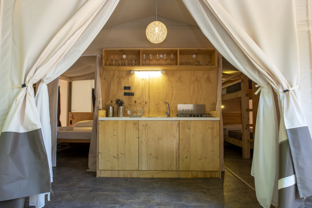 Die brandneuen Lodge Zelte sind mit allem Komfort ausgestattet. Im Inneren befinden sich ein Schlafzimmer mit Doppelbett und Safe, ein zweites Schlafzimmer mit einem Einzelbett und einem Etagenbett, ein Badezimmer mit Duschkabine und Waschbecken, ein gemütlicher Wohnbereich mit Kochnische sowie eine reizvolle und großzügige Außenveranda mit Tisch und Stühlen, die mit dem Wohnraum verschmilzt, wenn die vorderen Planen geöffnet werden.