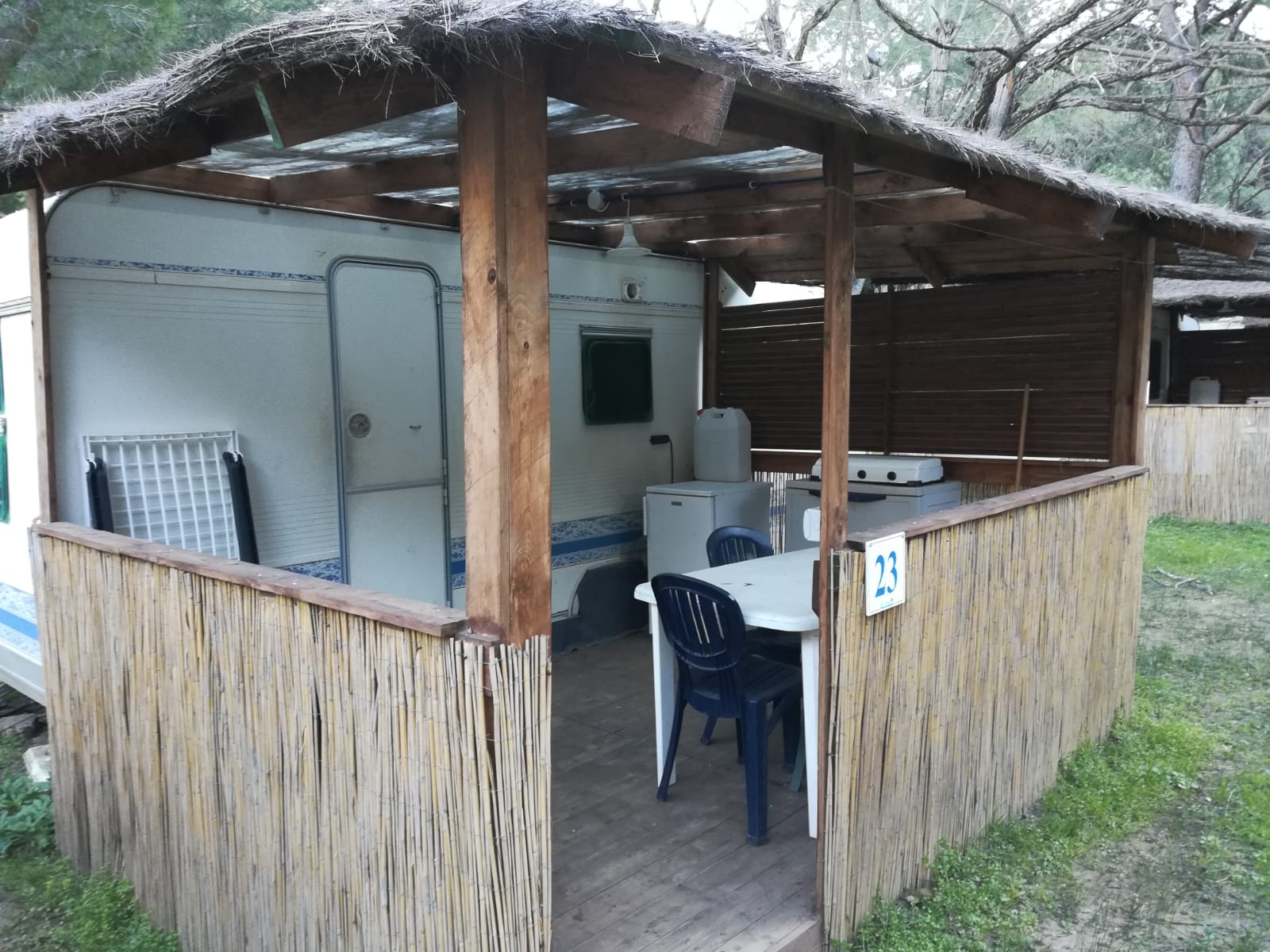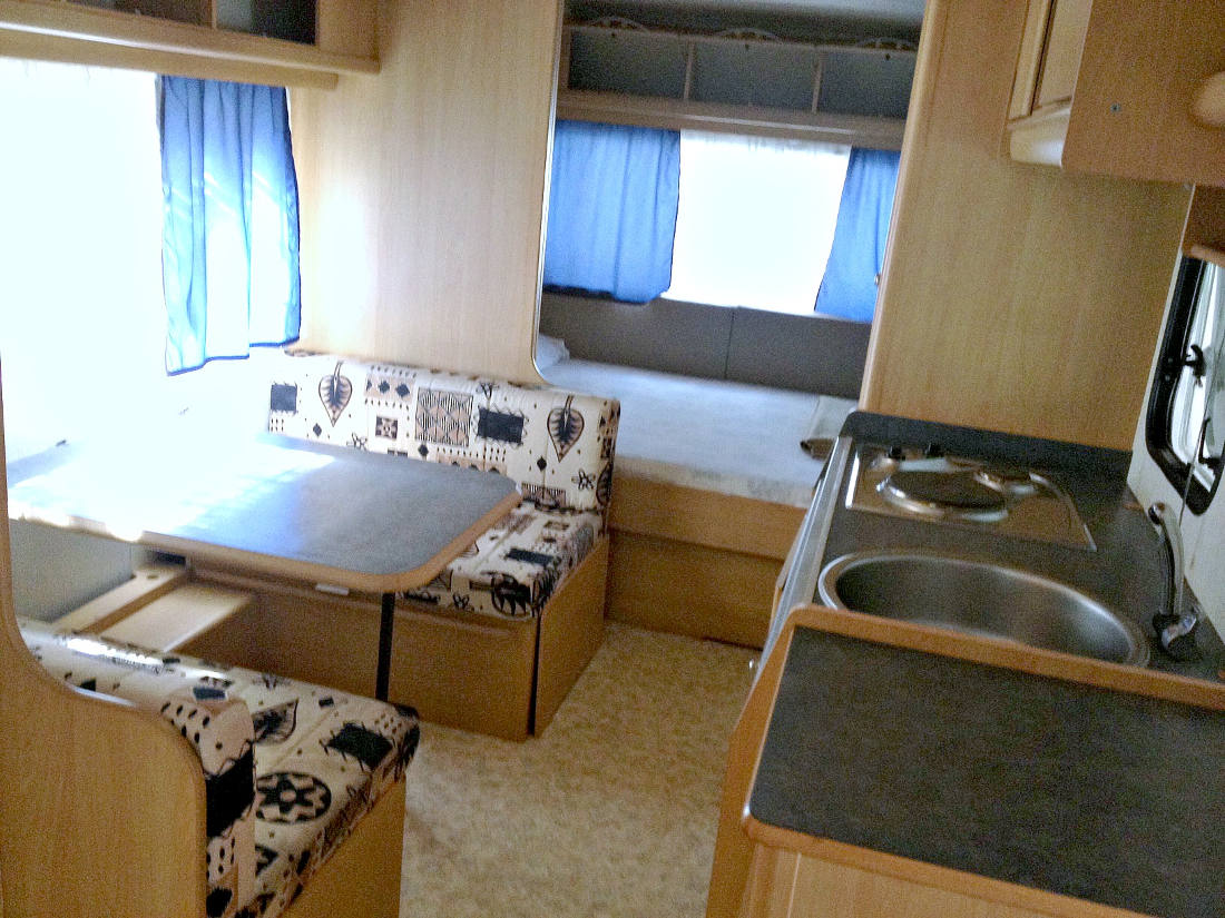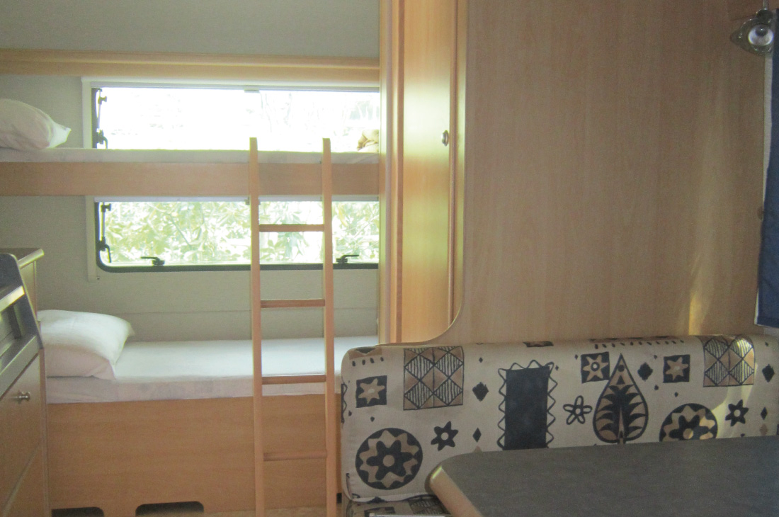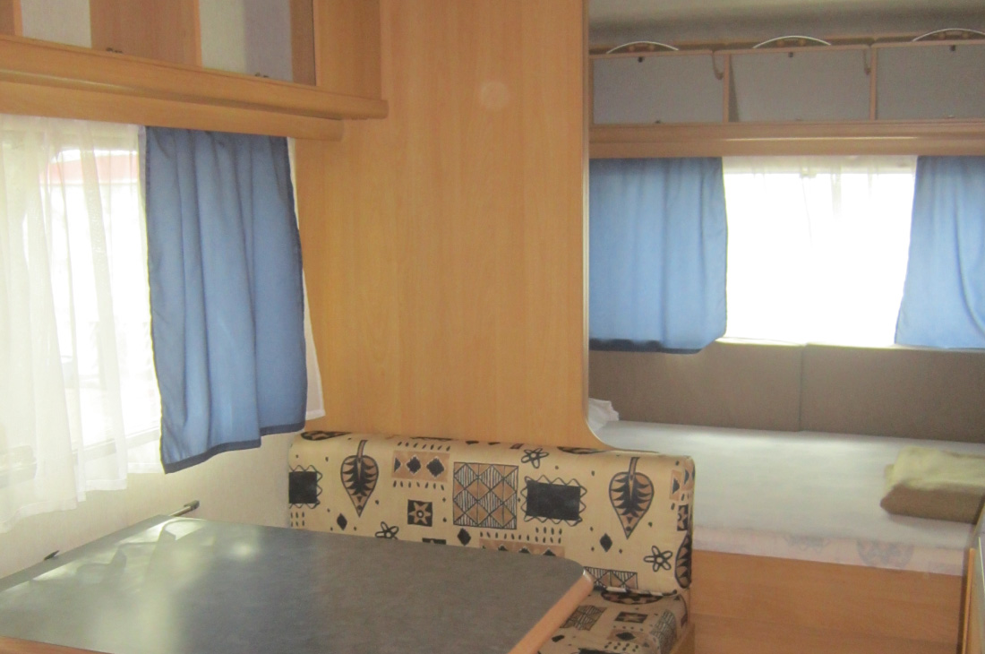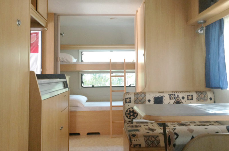 4/5-persoons caravans (zonder toilet en douche). Dit zijn caravans geschikt voor verblijf met familie of vrienden. Het interieur bestaat uit een tweepersoonsbed en een stapelbed, met eventueel een vijfde slaapplaats in de vorm van een eenpersoonsbed. Buiten is er een open houten veranda met tafeltje en stoelen, kooktoestellen en koelkast. Stromend water, sanitair en douche bevinden zich bij de centrale sanitaire voorzieningen van de camping. Bad- en bedlinnen niet inbegrepen.